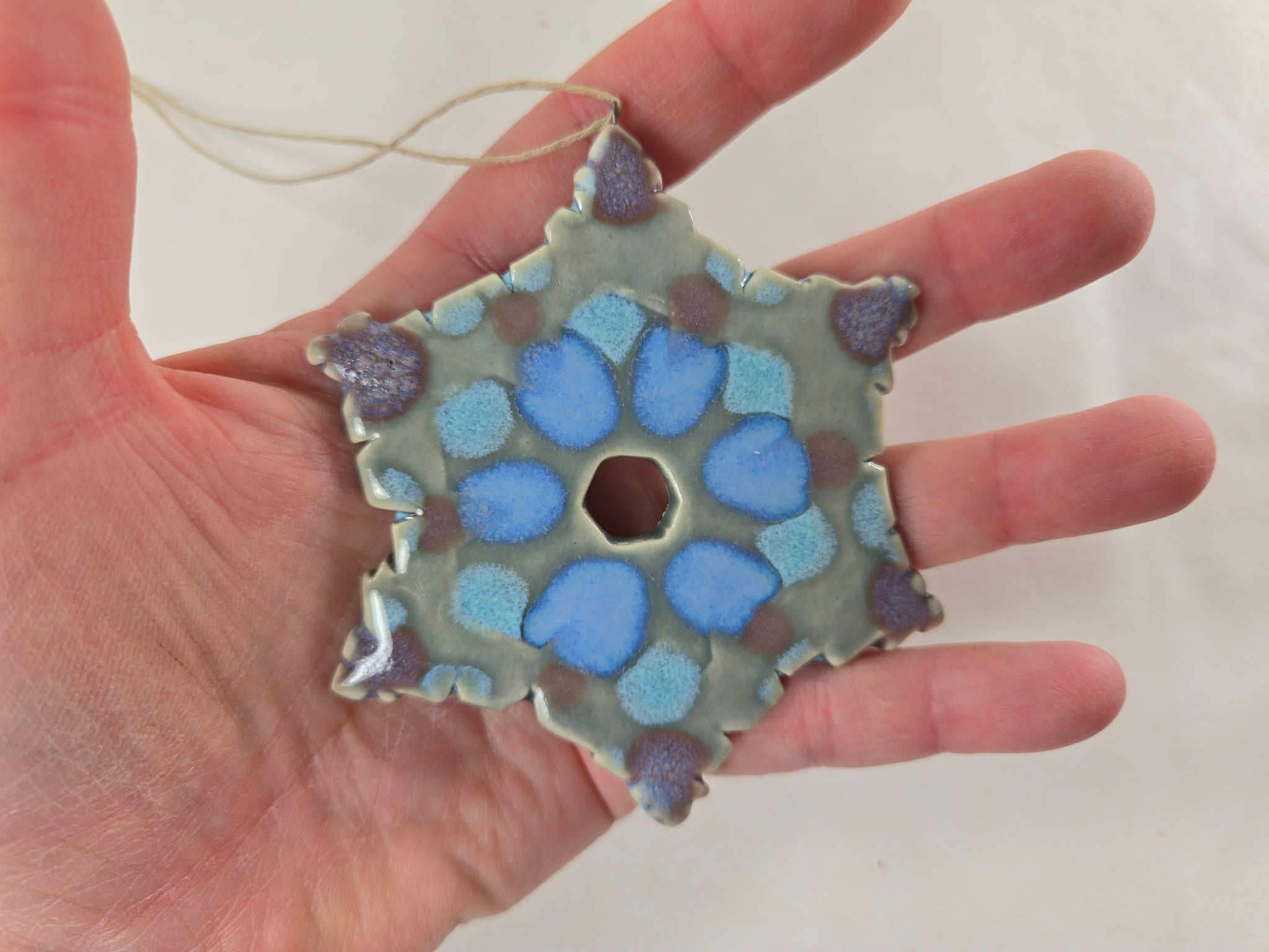 Christmas ornaments. I handmade them from stoneware clay, fired them in the kiln, glazed, and fired them again to 2232F. Includes a thin hemp (looks like raffia or twine) hanging loop.
