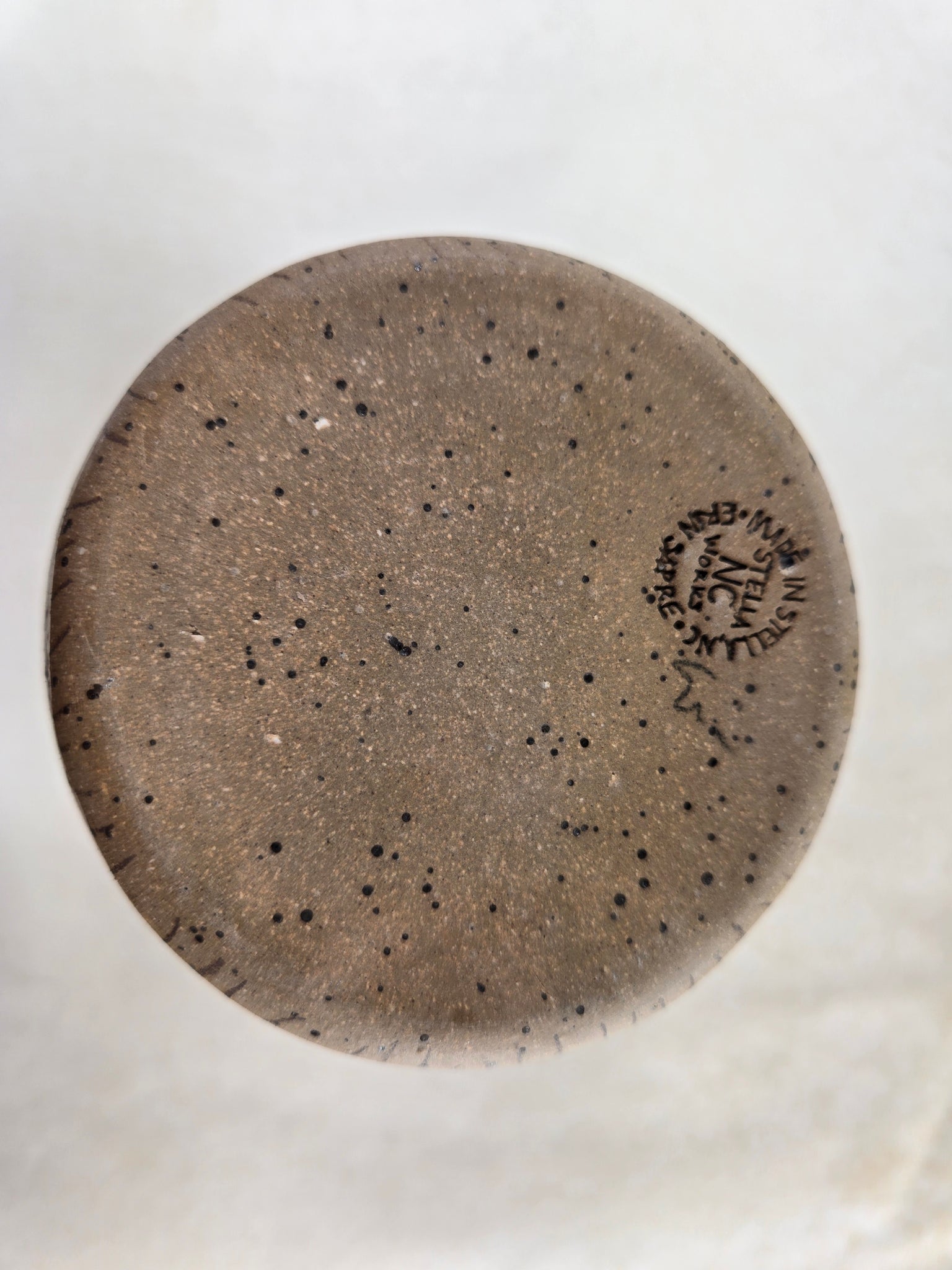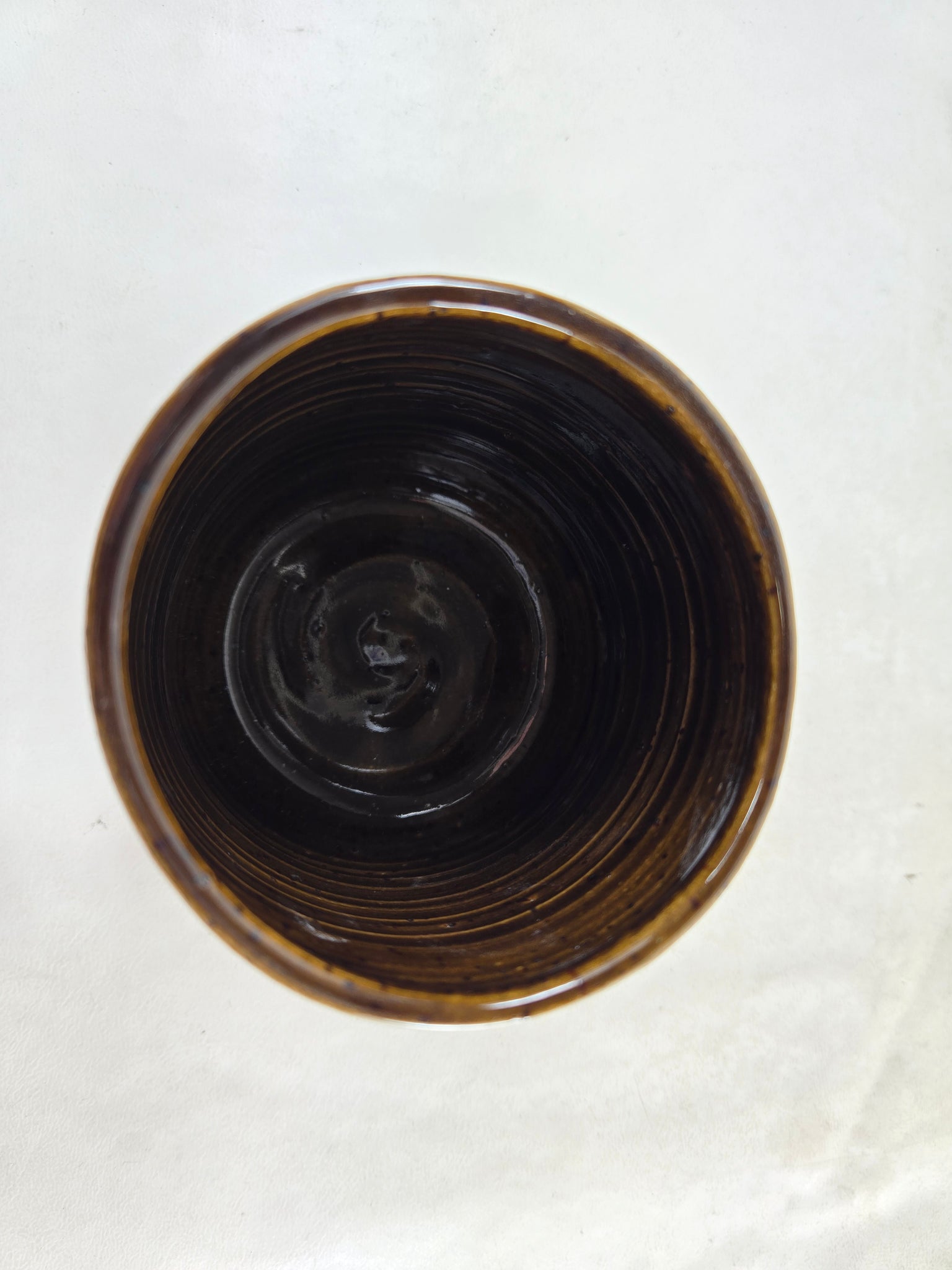 Handmade pottery cup, sold individually. Dimensions: Each are approximately 3.3 inches tall and 3 inches diameter. Comfortably holds 9 fluid ounces.