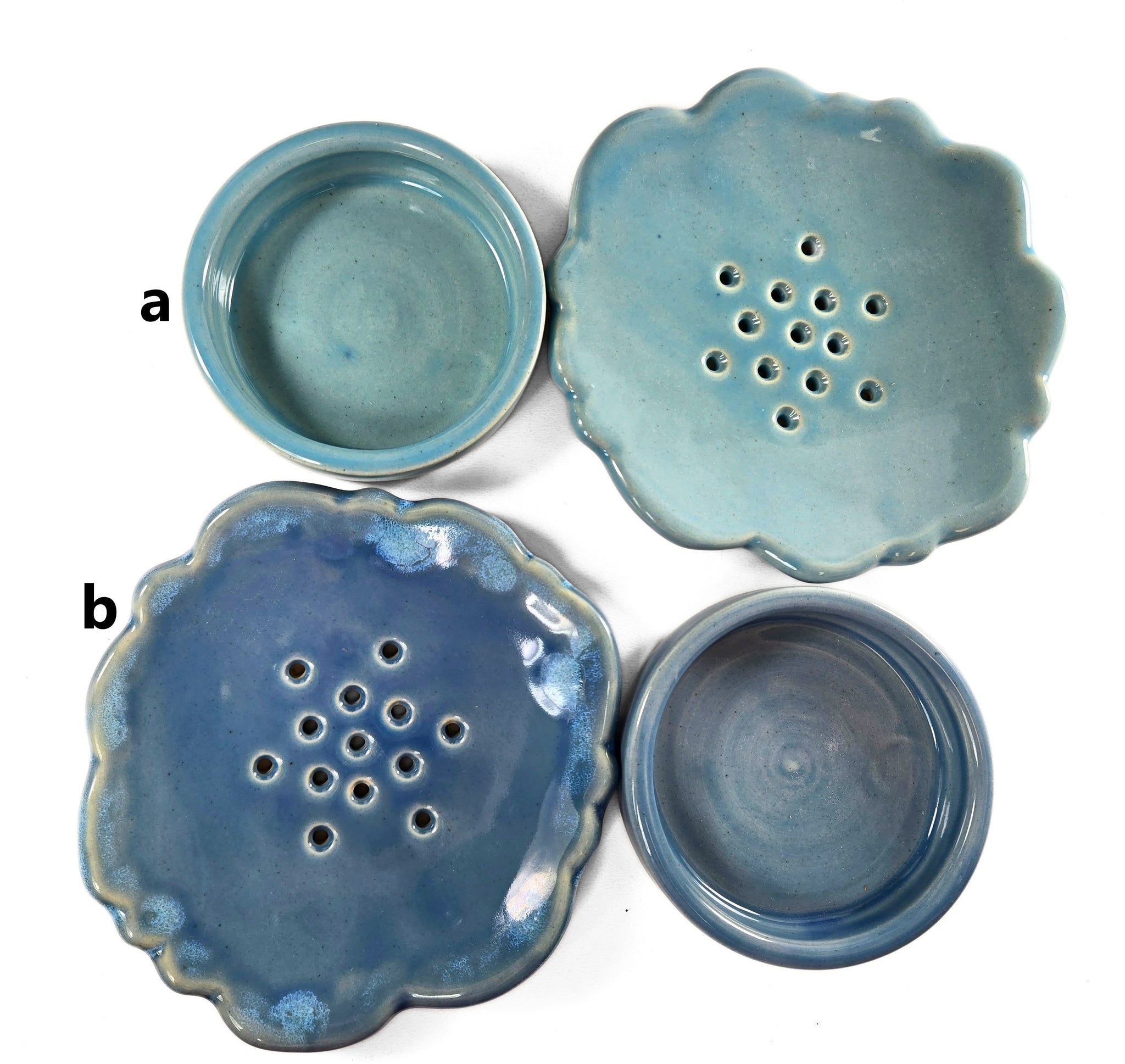 2-piece handmade pottery soap dish / sponge holder (has draining top and bottom dish) - I threw each base piece on the wheel and handbuilt the top piece, hand-cutting the holes, fired them in the kiln, glazed, and fired again to 2232F. After it was cool, I used fine-grit sandpaper so it has a smooth bottom :) The glazes are food-safe, and even un-glazed portions are non-porous.